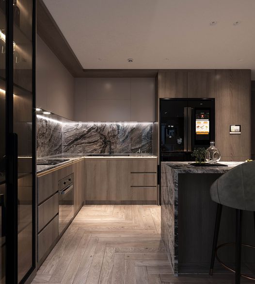 Khu vực bếp được tối ưu hóa công năng với thiết kế mở, kết nối liền mạch với phòng khách. Các thiết bị hiện đại như bếp từ, máy hút mùi và lò nướng được bố trí hợp lý, đảm bảo tiện nghi cho các bữa ăn gia đình. Bàn ăn đặt ngay gần khu vực bếp, mang đến sự thuận tiện và ấm cúng.